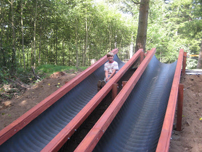 We also got the second installment of our "swingset" built. And, yeah, I talked myself and Jason and the kids out of the Costco one, even though is it a great playset. But, here's the cool part, we have a 20 foot double slide (for racing) going down the side of one of our hills, right off to the side of where the actual swing set is going to be built!! I am going to go take a picture and post it on here in a few minutes, but I have to go move laundry around :) Okay, here you go :)